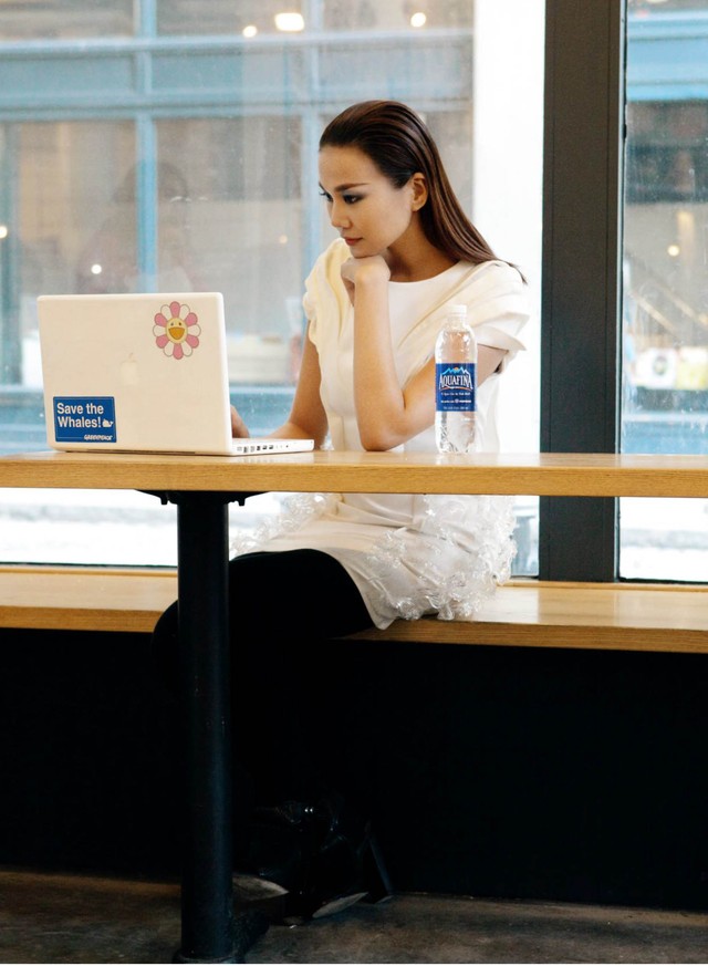 Trong cả ngày dài làm việc căng thẳng, siêu mẫu tìm kiếm sự thư thái, cân bằng cho cơ thể bằng cách tự nhắc mình uống nước đều đặn.