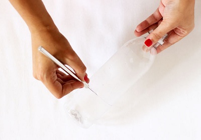 Bước 1: - Đầu tiên, bạn dùng dao cắt lấy phần đáy của chai nước. |